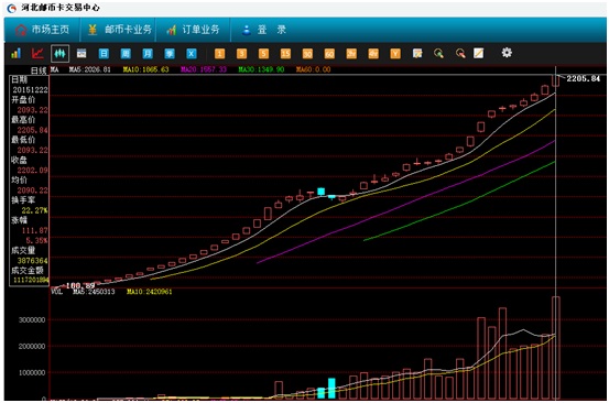 2015年12月22日,河北邮币卡日成交额再刷历史新高达11.1亿元,累计成交金额逼近百亿关口。位列全国邮币卡交易平台成交榜第二位!