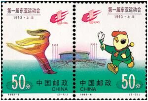 1993-6“第一届东亚运动会”,全套2枚,在第一枚“运动员”的右上角和第二枚“吉祥物”的左上角都有这届运动会的会徽。会徽由东亚英文的第一个字母“E”和阿拉伯字“1”构成,体现了第一届东亚运动会;E和1组成汉字“申”,象征在上海市举行。吉祥物为颈挂金牌,身着运动服,手持上海市花“白玉兰”的金鸡,取名为东东。