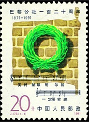 本套邮票仅1枚,是中国发行的第三套纪念巴黎公社的邮票。设计者突破了以往以历史画面、照片再现当年斗争场景的形式。画面以公社社员墙为背景,并把墙绘成巴黎公社旗帜的形状,中心悬挂长青的桂叶花环表示纪念。下面是《国际歌》最后一句的五线谱曲和歌词:“英特纳雄耐尔就一定要实现”。邮票艺术语言凝炼,构思含蓄隽永,画面新颖别致,格调庄严肃穆,突出、鲜明地体现了“公社精神永存”的主题。