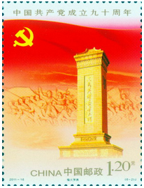 2011年是中国共产党成立90周年。隆重热烈地纪念中国共产党成立90周年,对于鼓舞全党全国各族人民意气风发地投身改革开放和社会主义现代化建设,坚定不移地把中国特色社会主义伟大事业推向前进,具有十分重要的意义。中国邮政特发行《中国共产党成立九十周年》纪念邮票一套6枚,小型张1枚。中国集邮总公司同时发行首日封一套7枚,启用纪念戳一枚。