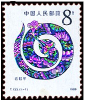 中国传统社会采用农历纪年,至今仍在中国的广大农村使用,因为它适合于季节性很强的农耕生产,这种与月亮的圆缺相关的历法又称“阴历”(因为古代中国人把月亮称为“太阴星”)。农历纪年是采用“天干”、“地支”相配;“天干”为甲、乙、丙、丁、戊、己、庚、辛、壬、癸;“地支”为子、丑、寅、卯、辰、巳、午、未、申、酉、戌、亥。拿十天干中的甲、丙、戊、庚、壬和十二地支中的子、寅、辰、午、申、戌循环相配,再拿十天干中的乙、丁、己、辛、癸和十二地支中的丑、卯、巳、未、酉、亥循环相配,便得六十种组合:甲子、乙丑……,称为六十甲子。而十二地支又分别和十二种动物组合起来:子鼠、丑牛、寅虎、卯兔、辰龙、巳蛇、午马、未羊、申猴、酉鸡、戌狗、亥猪;每年以一种组合为该年的“生肖”,该年出生的人均以此“生肖”作为自己的“属相”,每十二年循环一次。己巳年便是蛇年,这年出生的人属蛇。 本套邮票既要表达蛇年的喜庆,又要消除人们对蛇的恐惧印象。设计者在造型上,选择了盘蛇,借以体现蛇的动感和神圣感。画面设计独辟蹊径,整条蛇在画面上形成一个圆形图案,不但展示了蛇的整体形态和基本习性,而且充分地体现出蛇的机警和俏皮之态,蛇身绘满牡丹、荷花、菊花和梅花,头部口中吐出吉祥的灵芝草,尾是摇甩鱼一样的尾巴,整条蛇身隐含着一年四季吉祥如意,年年有余(鱼)之意。邮票画面整体感强,造型单纯简练,寓有团圆之意,富有美感。