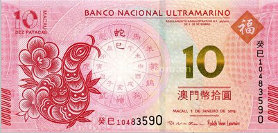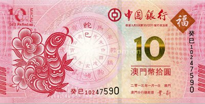 2013年3月1日,为庆祝中国农历新年蛇年的到来,由澳门特区政府批准,大西洋银行和中国银行澳门分行联合发行澳门生肖蛇钞各1枚,面值10元。该套生肖蛇钞为澳门系列生肖纪念钞的第二枚,也是2013年蛇年的第一枚新钞。