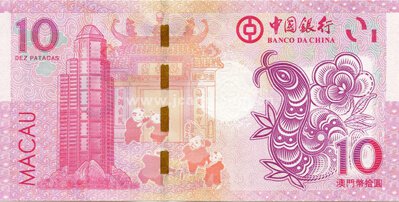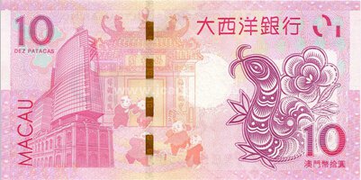 生肖纸币主色调为红色,尺寸138mm×69mm,纸钞正面设计中间为圆形十二生肖轮盘样式图案,左侧为传统蛇年图案,右侧标有面额“10元”和“澳門幣拾圓”字样,右上方印有中国“福”字样,上方注有发行行“中国银行”和“大西洋银行”字样。纸钞背面图案设计中间以“妈祖庙”为背景衬托,中间有金属防伪线,左侧为发行行总部大楼照片,右侧为传统生肖蛇图案,左上角和右下角分别标有面额10元字样。