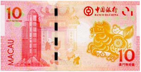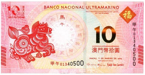 2014年,为庆祝中国农历新年甲午马年到来,由澳门特区政府批准,大西洋银行和中国银行澳门分行联合发行澳门生肖马钞各1枚,面值10元。该套生肖马钞为澳门系列生肖纪念钞的第三枚。