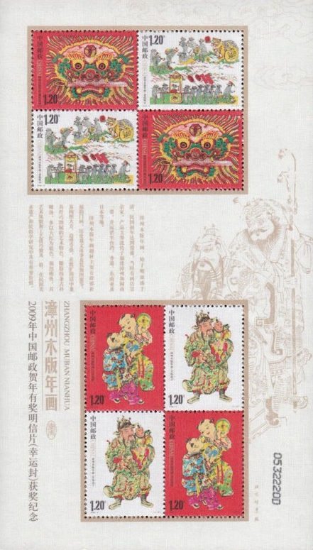 漳州木版年画作为非物质文化遗产资源,以“颜氏”木版年画为代表,是中国木版年画的一颗璀璨明珠。为进一步弘扬和宣传中华民族传统民间艺术,扩大漳州木版年画的影响,中国邮政集团公司特发行了由著名邮票设计