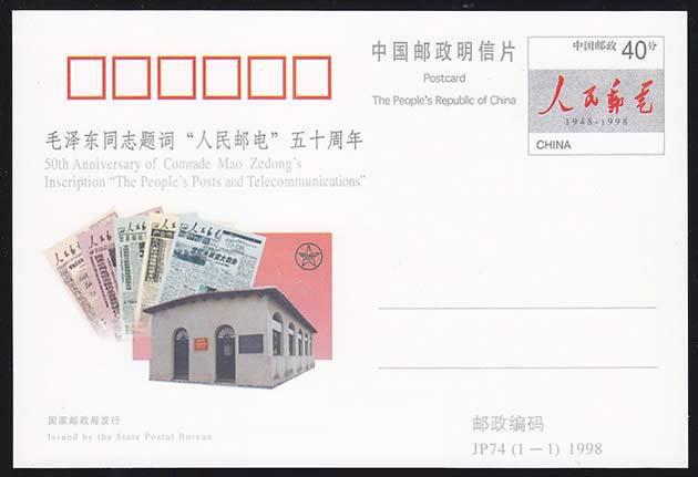 1948年12月26日西柏坡,意气风发的中国共产党领袖毛泽东奋笔写下四个大字“人民邮电”,这是一份即将创刊的报纸的报头,同时也指明了新中国邮电的性质、任务和方向。1951年邮电部出版了《人民邮电》杂志。1959年《人民邮电》杂志同《中国邮电工人》报合并,正式出版了《人民邮电》报。为纪念毛主席“人民邮电”题词50周年,充分展示人民邮电50年的发展成就,国家邮政局于12月26日特发行纪念邮资片一枚。邮资图为毛泽东当年题写的“人民邮电”手书真迹,片图为象征西柏坡的七届二中全会所在地,邮电行业的标志邮徽及5张分别刊有毛主席手迹和邮电建设成就的《人民邮电》报。