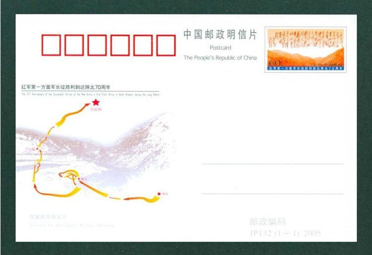 这枚邮资片采用毛泽东手书《七律.长征》为邮资图,以长征路线图作图案。《七律·长征》:“红军不怕远征难,万水千山只等闲。五岭逶迤腾细浪,乌蒙磅礴走泥丸。金沙水拍云崖暖,大渡桥横铁索寒。更喜岷山千里雪,三军过后尽开颜。”