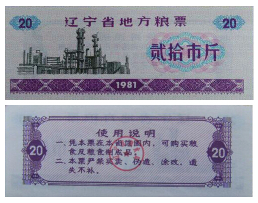 地方粮票是在粮食供应紧张时期,国家为避免不法之徒跨区域倒买倒卖粮票哄抬物价,而允许各省、市、自治区粮食局自行印发的粮票。票面额各地不一,一般有1市两、2市两、5市两、1市斤、2市斤、5市斤、10市斤等几种。各种粮票票面规定的数额均以成品粮计算。本品“1981年辽宁省地方粮票贰拾市斤”,即是在该特殊历史时期由辽宁省粮食局印发的粮票。