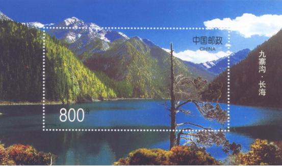 原邮电部于1998年3月26日发行九寨沟特种邮票1套4枚,同时发行小型张一枚。小型张面额800分,票面内容为“长海”,原图为王建军所摄。