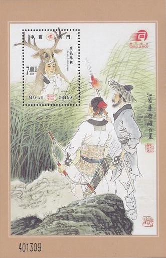 2002孝邮票小型张,是为纪念“世界邮政日”(10月9日),澳门邮政总局发行的以“孝”为主题的纪念邮票。该小型张使用防伪纤维纸,采用柯式平版印刷工艺,图案为“鹿乳奉亲”(由内地著名画家江恩莲、曾嵘绘制),美轮美奂、精彩绝伦。该小型张发行量少,设计水准处于较高水平,极具收藏价值。