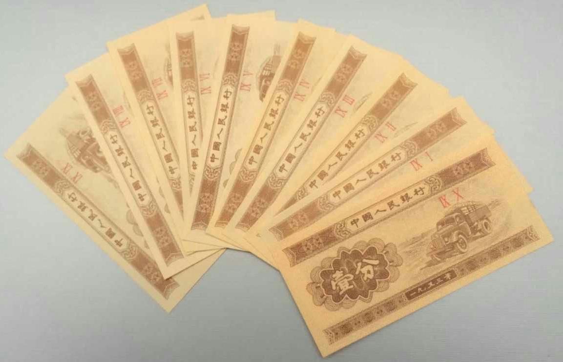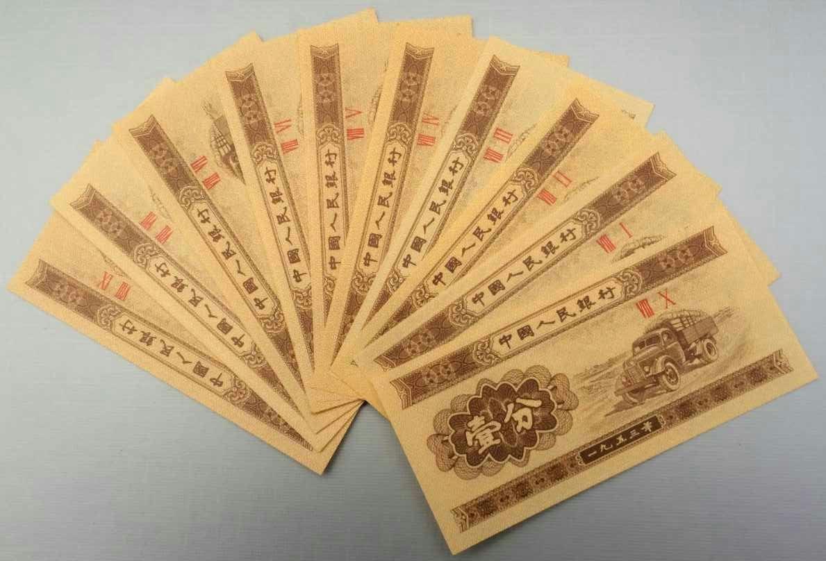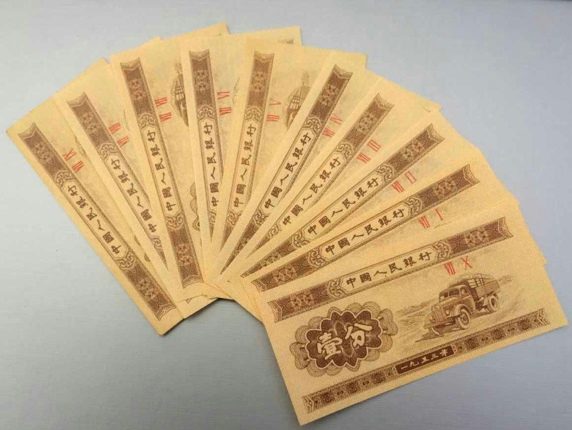 1953年版壹分纸币,主色为米黄色,正面图案为汽车,背面图案为“中国人民银行壹分”的汉、蒙、维、藏四种文字图案(人民币首次综合采用三种民族文字设计)以及国徽,票额尺寸为90毫米×42.5毫米。