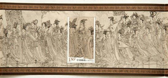 二是创新小本票结构形式。邮票主图选取6个局部画面来表现画卷的精彩细节,但不能完整展现画作整幅的通体流畅感,于是采用小本票形式予以弥补。在小本票的封面和尾页各有一个插片,当小本票折叠时与正常小本票无差别,一旦从插片中取出整幅展开,就是一幅完整的《八十七神仙卷》长卷。