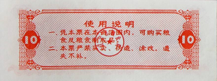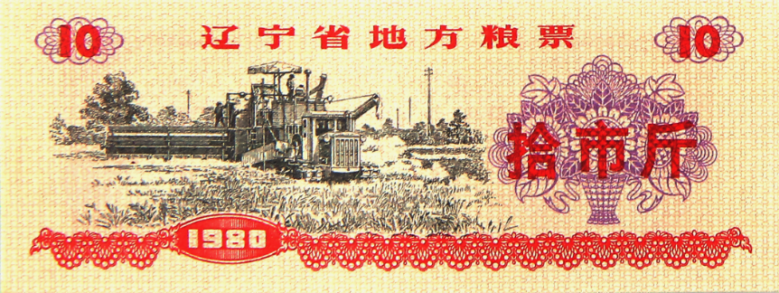 地方粮票是在粮食供应紧张时期,国家为避免不法之徒跨区域倒买倒卖粮票哄抬物价,而允许各省、市、自治区粮食局自行印发的粮票。票面额各地不一,一般有1市两、2市两、5市两、1市斤、2市斤、5市斤、10市斤等几种。各种粮票票面规定的数额均以成品粮计算。本品“1980年辽宁省地方粮票拾市斤”,即是在该特殊历史时期由辽宁省粮食局印发的粮票。