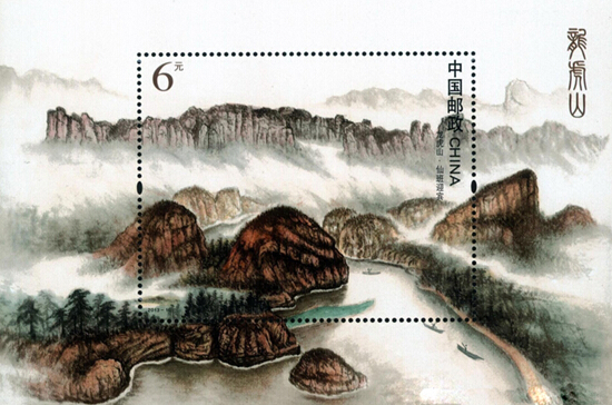 龙虎山碧水丹山秀其外,道教文化美其中。龙虎山以数千年的道教文化积淀,被公认为:“道教第一山”。中国邮政发行《龙虎山》特别邮票,全套邮票3枚,另有小型张1枚。票图名称分别为丹山碧水、龙盘虎踞、道教祖庭,小型张票图名称为仙班迎宾,邮票设计者为丁忠兵,邮票采用影写版印制,印制厂为北京印刷厂。