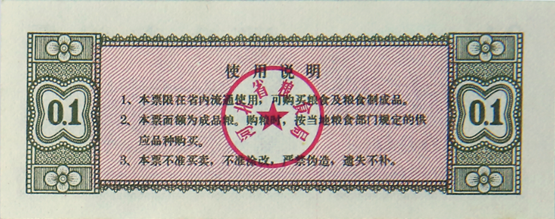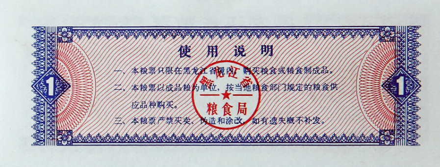 地方粮票是在粮食供应紧张时期,国家为避免不法之徒跨区域倒买倒卖粮票哄抬物价,而允许各省、市、自治区粮食局自行印发的粮票。票面额各地不一,一般有1市两、2市两、5市两、1市斤、2市斤、5市斤、10市斤等几种。各种粮票票面规定的数额均以成品粮计算。本品“1978年黑龙江省粮票壹市斤”,即是在该特殊历史时期由黑龙江省粮食局印发的粮票。