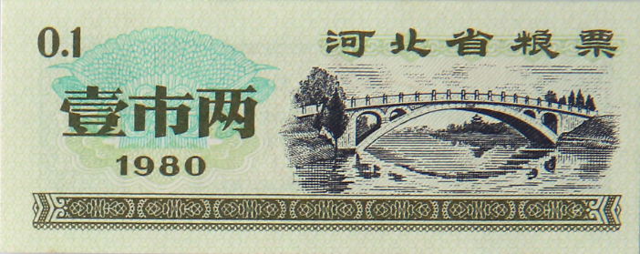 地方粮票是在粮食供应紧张时期,国家为避免不法之徒跨区域倒买倒卖粮票哄抬物价,而允许各省、市、自治区粮食局自行印发的粮票。票面额各地不一,一般有1市两、2市两、5市两、1市斤、2市斤、5市斤、10市斤等几种。各种粮票票面规定的数额均以成品粮计算。本品“1980年河北省粮票壹市两”,即是在该特殊历史时期由河北省粮食局印发的粮票。