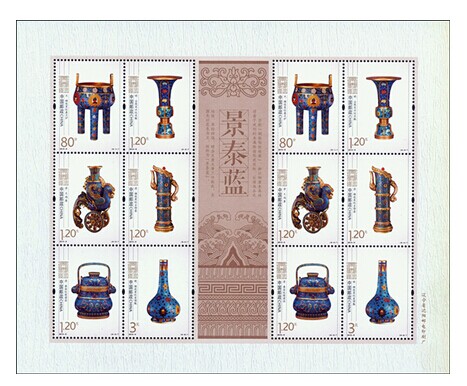 中国邮政定于2013年4月21日发行《景泰蓝》邮票一套6枚,全套面值8.60元。邮票规格30毫米×40毫米,由夏竞秋设计,辽宁省沈阳邮电印刷厂胶版印制。6枚邮票展现了元、明、清各朝代的景泰蓝顶级珍品,原件现藏于故宫博物院和台北故宫博物院。邮票印制采用调频超高网线多色印刷方式,将金属油墨置于下,色彩位于上,金属的光泽透过彩色若隐若现,很好地表现了景泰蓝器物的丰富色彩与质感,精致逼真。
