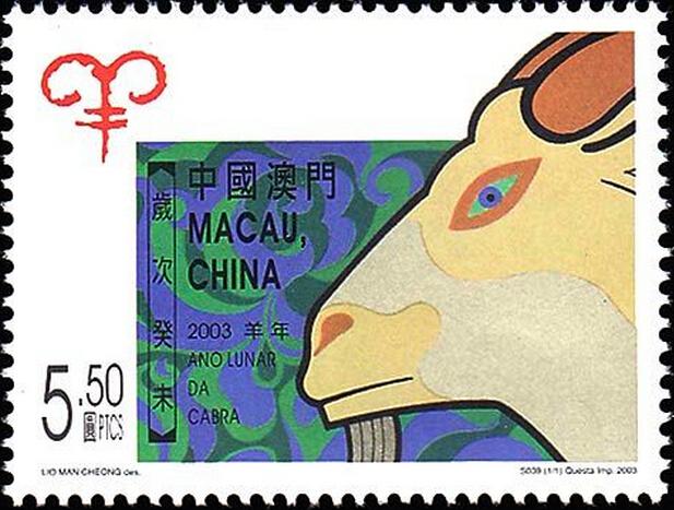 中华人民共和国澳门特别行政区邮政于2003年1月2日发行《羊年》邮票一套一枚,面值为5.50元。澳门作为中国的特别行政区,由于其人口稀少,所以邮票的发行量也很小,仅发行50万枚,另外其邮政部门还沿用邮寄业务贴用邮票的传统,所以自2003年至今的通信消耗量也很大,更重要的是澳门邮政实行邮票零库存的政策,所发行的邮票全部流出分别使用和收藏。
