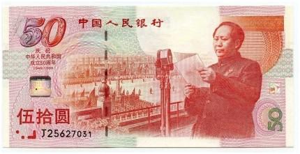 为纪念中华人民共和国建国五十周年,中国人民银行自1999年9月20日起,面向全国发行“中华人民共和国成立五十周年”纪念钞,这是中国首次发行纪念钞,与现行人民币等值流通。此纪念钞主题鲜明,寓意深刻,技术高超,代表了我国钞票设计和印制的最高水平。