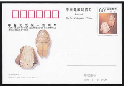 为纪念甲骨文发现一百周年,国家邮政局发行纪念邮资片一枚,邮资图和片图均为刻有甲骨文的殷墟甲骨。
