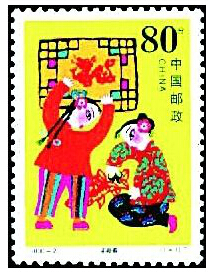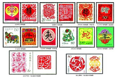 由于传统的民间剪纸有着浓郁的吉祥喜庆气氛,因此在我国近些年发行的生肖邮票中剪纸艺术被多次应用。在第二轮12套24枚生肖邮票中的剪纸图案分别有1992年《壬申年》的“猴桃献瑞”和“喜鹊登梅”、1993年《癸酉年》的“雄鸡报晓”和“四季吉祥”、1994年《甲戌年》的第二枚“祥瑞兴旺”、1995年的《乙亥年》的第二枚“喜迎新春”、1997年的《丁丑年》的“金牛奋蹄”和“牛耕年丰”、1999年《己卯年》的第二枚“吉祥如意”、 2001年《辛巳年》的“祥蛇祝福”和“祥运普照”以及2003年的《癸未年》第二枚“三阳开泰”等。这些邮票中剪纸图案有的直接取材于民间,有的则是在原作基础上再创作。如“雄鸡报晓”一枚,图案选用的是河北省献县本斋乡邓家庄蔡兰英老人的剪纸“百鸡图”中的一幅,而“金牛奋蹄”一枚,图案是根据山东高密民间艺人齐秀花的剪纸“媳妇骑牛”再加工创作而成的。另外,我国发行的个性化服务专用邮票中也有吉祥喜庆的剪纸图案,即2005年11月6日的《岁岁平安》和2005年11月11日的《喜上眉梢》。