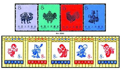 剪纸作为艺术百花园中的一朵奇葩,在我国邮票图案设计中应用也非常广泛。1959年1月1日我国发行了一套专题《剪纸》的特种邮票,全套4枚,图案分别为“骆驼”“石榴”“公鸡”和“戏剧人物”,是一套典型的民间传统剪纸邮票。2010年8月16日发行的《民间传说——牛郎织女》特种邮票,这是采用民间剪纸的艺术形式设计、表现民间故事的一套邮票。1973年6月1日发行的《儿童歌舞》编号邮票,全套5枚,图案分别为汉、蒙古、藏、维吾尔和朝鲜5个民族的儿童歌舞剪纸。2012年7月1日发行的《城乡居民社会养老保险制度全覆盖》纪念邮票,全套一枚,图案为一盏宫灯造型的剪纸。宫灯中一对开怀而笑的老年夫妇以及作为背景的新房和农村风貌,反映了城乡居民社会养老保险制度全覆盖后,老年人生活无忧的社会图景,体现了我国城乡居民社会养老保险制度推行的重大成果和重要意义。后面两套都是反映新事物、歌颂新生活的新题材剪纸邮票。