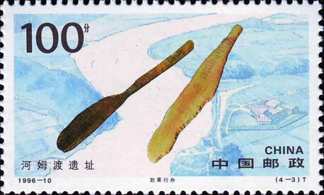 “划桨行舟”邮票以河姆渡遗址出土木桨为主题,背景配以蜿蜒的姚河,票面左侧木桨桨叶长27.8、厚2、柄宽3.5、残长62厘米,由整段木料加工而成,现藏于河姆渡遗址博物馆。河姆渡遗址遗址共出土木桨8支,有桨一定有船,推测河姆渡人已划着独木舟在湖泊之中捕鱼采菱,也可能用于氏族间交流时的交通工具。
