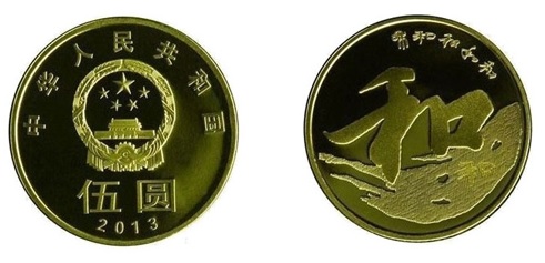 【正面图案】主景图案为中华人民共和国国徽,内缘上方刊“中华人民共和国”国名、下方刊面额“伍圆”及年号“2013”。
