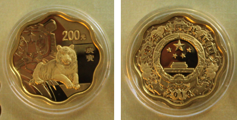 生肖意义上的“庚寅虎”,是民间传统装饰虎造型,像剪纸,也像布艺,其特点,是以大红为主色调,配以黄,染以绿,点以黑,缀以蓝,借以烘托出传统春节热烈、祥和、喜庆、欢快的气氛。民间大众对于“虎”的敬畏,源于汉民族对虎图腾的崇拜。虎是百兽之王,始终被看作是正义、勇猛、威严的象征。金银币上“庚寅虎”,额上有三横一竖大“王”字,就是民间惯有的以虎为大的追捧表现。敬虎崇虎的文化意识,是中华民族共同的文化观念。与之相对,“庚寅虎”下压的,是一组吉祥花卉图案。在民间,生肖与花卉,同有“幸福美好”、“吉祥如意”的喻意。其中国色天香的牡丹,象征大富大贵,类似吉祥物,在民间比比皆是,反映了人们对幸福生活的向往。另一种出淤泥而不染的荷花,是高尚品德的象征。荷花丛生,则是本固枝荣,则是家道昌盛。“庚寅虎”上吉祥花,应该是两层意思共兼之。而彩色的生肖“虎”与原色的吉祥“花”,在视觉上构成强烈而过度反差,这也恰恰浓写了对2010庚寅年幸福生活的向往和吉祥福喜的寄托之情。