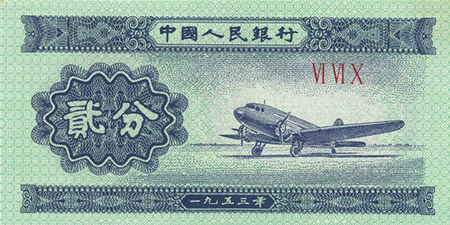 1953年版贰分纸币,主色为蓝、浅蓝色,正面图案为飞机,背面图案为国徽和汉、蒙、藏、维4种文字的“中国人民银行”及“贰分”字样,票额尺寸为95毫米×45毫米。