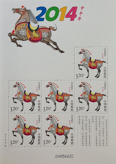 农历甲午年是马年马是中华民族自强不息、坚韧不拔、奋发进取精神的象征。从秦代马俑、汉代铜马到唐三彩马,各个时代、不同质地、不同形态的马栩栩如生,反映出自古以来人们对于马的钟爱。为迎接2014中国甲午马年,中国邮政定于2014年1月5日发行《甲午年》特种邮票1套1枚,面值1.20元,小版6枚/版,总面值7.20元。自1980年发行生肖系列邮票以来,2014年生肖马已是该系列邮票的第三组第11枚邮票。在这小小的方寸之间通过生动的设计,呈现具有鲜明的传统艺术特色,并且融合了现代人文情怀。