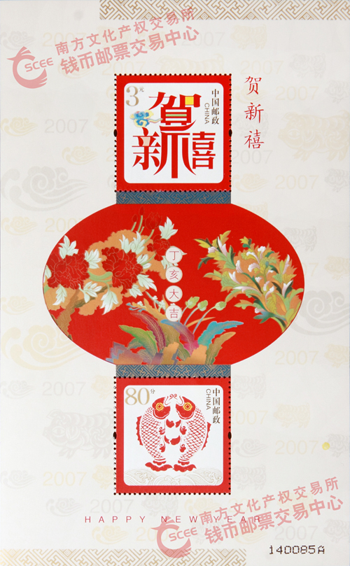 贺喜一小全张需要有一个挖掘和再发现的过程。贺喜一小全张是随2007年中国邮政贺年有奖明信片的幸运封一起出售的,分散得很彻底。它的发行量为365万,估计国版200万,企业版165万,合计为365万,也属于缩量品种。它和贺喜二小全张不同,贺喜二分国版、企业版、加字广告版三种,这就加大了它的发行量,所以,相对地,贺喜一小全张显得更为珍稀,含金量也就不言而喻了。