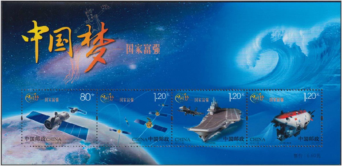 该套邮票作为中国梦的第一套系列邮票,以“中国梦·国家富强”为内容,具体展现了近年来“神十、北斗、蛟龙、航母”四个方面的伟大成就,体现了国家富强和社会关注的焦点内容,为国庆献礼。中国邮政定于2013年9月29日增加发行《中国梦(第一组)——国家富强》邮票一套4枚、小全张一枚。内容为蛟龙号、辽宁号、北斗卫星、神舟十号。