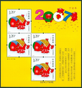 《黄猪小版》邮票画面以平面的手法模拟木偶漆器玩具的立体感,表现了猪的憨态可掬的形态。猪妈妈慈祥地守护着自己的孩子,猪妈妈的形象充满个性与人性的光彩,洋溢着亲情的温馨。体现了“家和万事兴”,表达了中国传统的“和”文化,即“和谐”、“和睦”、“和气生财”等。画面用大红色为基调,营造了吉祥喜庆的气氛,可喻为当今“红红火火”的国力发展。