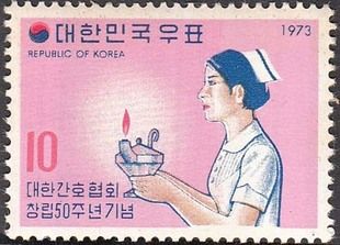 第一枚是韩国1973年发行的10韩元面值护士节邮票。