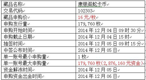 经广东省南方文化产权交易所钱币邮票交易中心(以下简称“本中心”)专家委员会、藏品挂牌审核小组研究决定,102303《康银阁蛇卡币》将于2014年12月04日发行申购,具体事项如下: