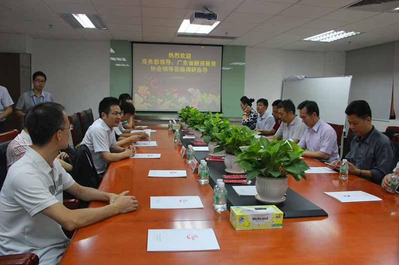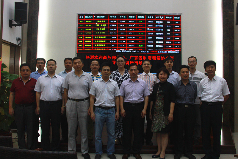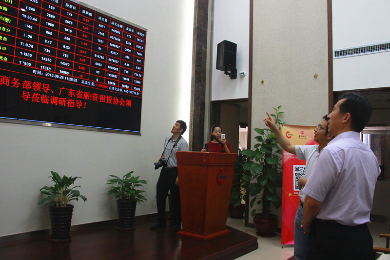 2015年9月26日上午,商务部国际贸易经济合作研究院党委书记兼副院长任鸿斌,商务部外国投资管理司原巡视员刘作章,广东省融资租贷协会会长陈宝国,商务部研究院信用与电子商务研究所所长、商务部研究院信用认证与评级中心主任韩家平,广东省融资租贷协会等一行人莅临南方文交所做调研指导。