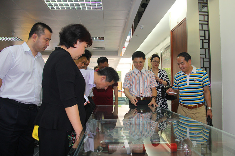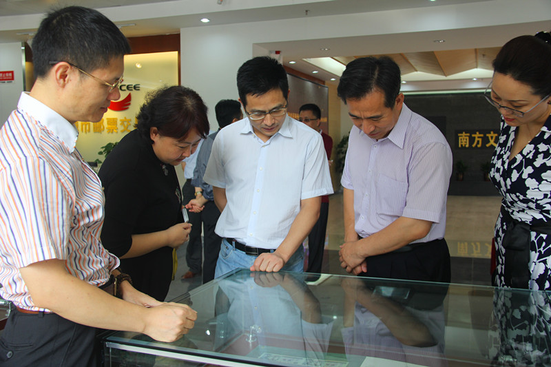 在南方文交所总经理张志兵、本中心总经理江则昊的陪同带领下,商务部国际贸易经济合作研究院党委书记兼副院长任鸿斌等一行人首先参观了南方文交所一楼的钱币邮票藏品展示厅以及文化展区。