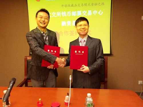 融资易CEO徐科飞与南方文交所钱币邮票中心主任江则昊在战略合作协议书上盖章