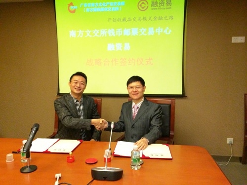 2015年2月1日,南方文交所钱币邮票中心与“融资易”平台正式签署战略协议,该平台向南方文化产权交易所钱币邮票中心投资人会员授信10亿元。