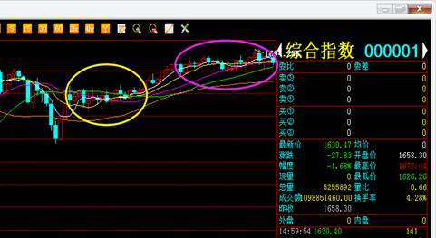 在我看来,图形无论走出什么形态,但在其在结果出来之前,都有他内在的原因和必然的过程。既然眼前的行情我们看不清楚甚至无从判断,那么就让我们把眼光放远,把图形缩小,试着从已经走完的历程中,去寻找一些蛛丝马迹来帮助我们更好的了结现状。