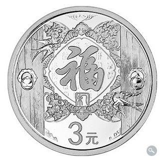 该枚银质纪念币正面图案为中华人民共和国国徽,并刊国名、年号。该枚银质纪念币背面图案为“福”字造型,配以蝙蝠、迎春花等装饰图案,以及宅门、燕子等造型组合设计,并刊面额。