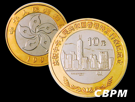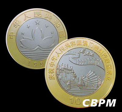 面对国际风云变幻,中国经受住了苏联东欧剧变的冲击和西方制裁的考验,不仅在国际上站稳了脚跟,还进一步改善了中国的国际环境,进一步巩固了周边睦邻友好关系。中国先后对香港、澳门恢复行使主权,祖国统一大业取得历史性突破。沈阳造币厂有幸以产品发行的形式见证了这两大重大历史时刻。1997年6月设计生产双色流通纪念币,在国内首次采用双金属套印技术,添补了一项国内空白,是中国造币技术进步的一个里程碑,为香港回归献上一份厚礼。1999年沈阳造币厂又铸造“庆祝中华人民共和国澳门特别行政区成立”的双金属流通纪念币1套2枚,面额为10元。同年,该双金属流通纪念币获1999年金融科技进步一等奖,该生产工艺于2000年取得国家实用新型专利。