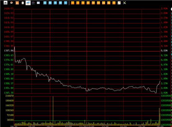 南方所综合指数今日平开1387.94点,随后快速向下,低位盘整后反弹无力,再度向下突破并且创出新低,今日整体延续这样的震荡下挫的节奏,最低点一度到打1347.39点,虽然尾盘有所拉升,但是并不影响今日整体的格局,收市最终下跌-30.18点,下跌幅度-2.17%,最终收盘1357.75点,今日的走势充分证明市场买盘无力,广大投资者需谨慎。