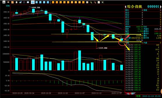 从上图我们可以很清楚的看到,大盘后续发展可能会走的两条路,红色箭头代表反攻,也是我们比较看好的选择,黄色箭头表示大盘将会继续下行,扩大跌幅,这种情况也有一定的可能,但是如果这样,走势就会破位,短期难以再有机会,所以笔者认为这种可能较小。当然,无论如何,关注1400点即可。
