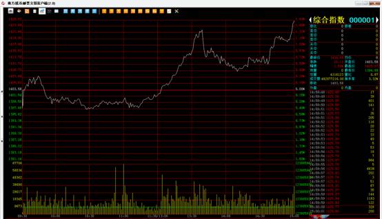 今日南方文交所综合指数开盘1403.58点,最高触及1425.97点,最低下探1394.88点,最终以1424.68点收盘,涨幅1.50%。成交量4.8亿。早盘时段略有犹豫,并向下测试1400关口,虽有跌破,随后拉升上来,午盘后,市场开始发力,快速上升,在触及5日均线压力时,盘中也进行了快速整理,截止收盘几乎收复昨日跌幅。