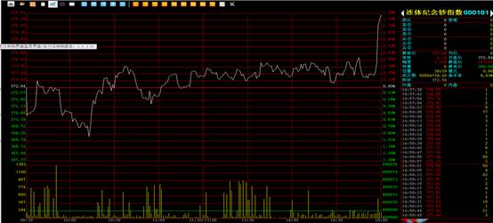 指数全天最高报收377.6点最低下探至369.06点。截止收盘指数报收376.68点,上涨4.14上涨幅度为1.11%,成交额为5055.4万元,成交量基本持平。值得留意是指数尾盘的异动,笔者翻阅了同板块的其它藏品走势,发现只有建国钞(百连)分时图走势与之相仿,都是尾盘的一段急拉至红盘收盘。如果指数出现失真时可能会对投资者带来困惑,建议投资者仍以分析藏品走势为主,结合指数辅助研判。
