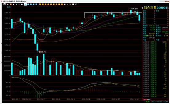 今日市场在早盘走出震荡行情,开盘后综合指数一度上冲至1636点附近,经过多次冲击都不能有效的突破1640点一线。上午十点半以后,行情开始出现下挫,一些品种纷纷跳水,临近上午收盘,综合指数跌幅超过1%。午后,市场继续维持低位盘整,综合指数在临近下午一点半时再次开始跳水,至下午两点半以后下探至1550点一线。从技术上看,前期在1600点至1650点这个区间的盘整已经结束,综合指数最终选择了向下突破。日K线上看,综合指数收出大阴,短线只能关注1550点一线以及60日均线的支撑。下方MACD指标出现继续向下扩散的走势,关注DIF线与DEA线能否在MACD0轴附近获得支撑。