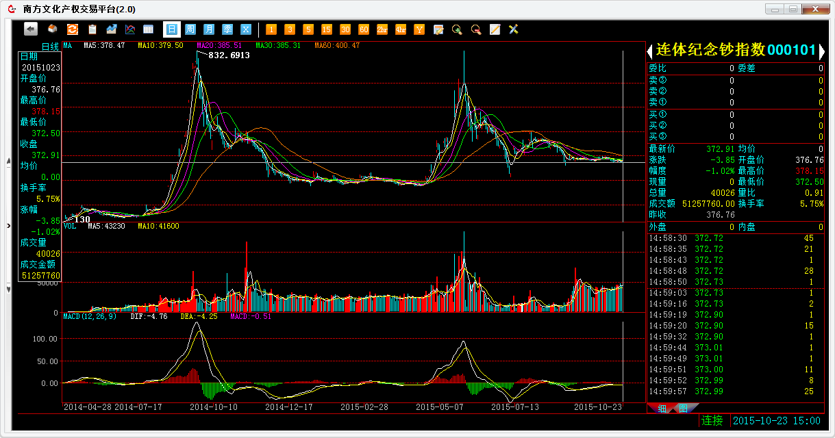 连体纪念钞版块指数这几天依然处于整理状态。截止收盘指数报收372.91点,跌1.02%。指数全天最高为378.15点最低下探至372.50点。成交量40026,成交额为5125.8万元(占大盘4.23%)。板块中11个品种里面,1涨10跌整体下跌,上涨幅度最大的是101007-单龙钞(百连)(+0.17%),跌幅最大的是101011-分币八连体(-3.26%)。