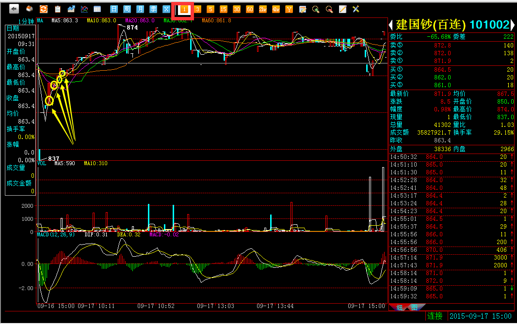 从上图1分钟K线可见,MA5(白色)连续击穿MA10,MA20,MA30,MA60.线。随后K线就一直没跌下过击穿点的价位。各位投资者若在做短线时可看到这种上涨的信号,可适量介入。在MA5技术线往下击穿时放出。